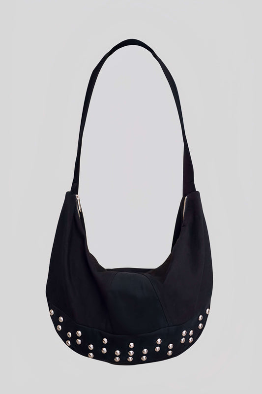 LARGE STUDDED DENIM HOBO BAG 黑色牛仔布鉚釘流浪漂流人包(黑色內裡)